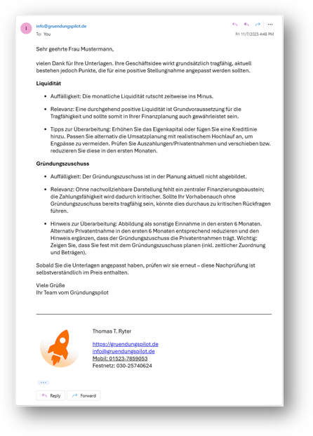 Unsere Kund:innen erhalten in den allermeisten Fällen im ersten Schritt erstmal Feedback von uns, um Ihre Chancen auf den Gründungszuschuss zu erhöhen.